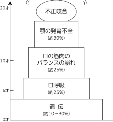 「口呼吸」「鼻づまり」「口の周りの筋肉が弱いために起こる機能不全」が原因の場合が多いのです。
