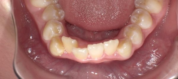前歯が、重なっている場合は、顎の横幅が狭いことになり、顎の成長が、遅延していると判断します。大切なのは、「なぜ?」顎の遅れが生じたのか?が大切です。