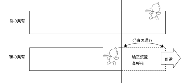 この2年間の差を埋るのは、日常生活で至難の業(しなんのわざ)。この「歯の発育」に「顎の発育」を追い付かせるために、「矯正装置」と「鼻呼吸」を指導して、「顎の発育」を促すことが、発育矯正なのです。